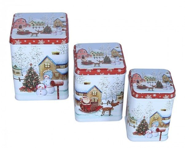 Krásné vánoční plechové dózy s motivem zimní vesničky, sněhuláka a Santa Clause. Ideální pro ukládání cukroví, sladkostí, drobných dárků nebo vánočních dekorací. Skvělý doplněk k vánoční výzdobě i praktický obal pro vaše domácí dobroty.