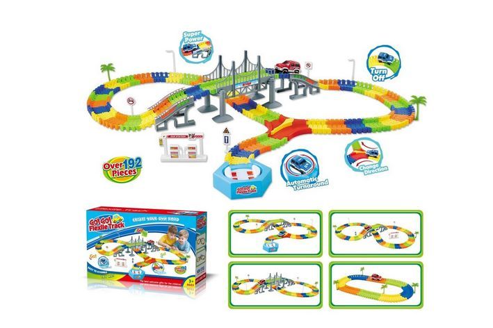 Variabilní dráha 192 dílů s točnou. Součástí jedno autíčko, lanový most a točna, která autíčko automaticky otočí zpět na dráhu. Provoz na 2×1,5V AA tužkové baterie – nejsou součástí. V nabídce červené/modré autíčko. Jednoduché na sestavení.