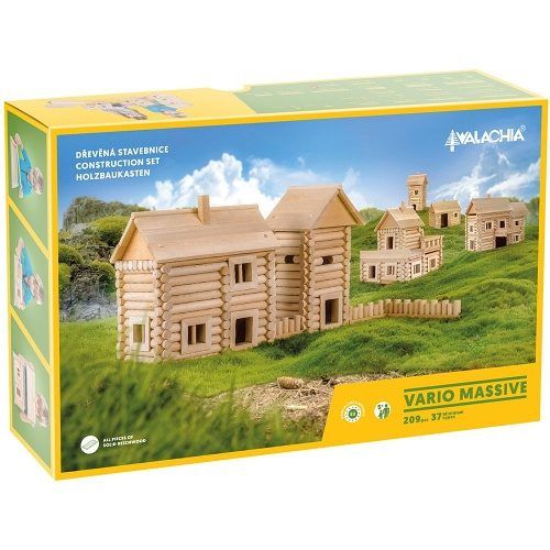 Vario Massive 209 dílků dřevěná stavebnice Walachia. Klasická dřevěná česká stavebnice od Walachie ze které složíte minimálně 37 typů staveb. Velkou výhodou všech VARIO stavebnic je jejich vzájemná kombinovatelnost, takže ve spojení se stavebnicí VARIO a VARIO XL lze postavit skutečně monumentální stavby dle vlastní fantazie. Stavebnice z masivního bukového dřeva ( průměr 15 mm ). Lze ji skládat i rozkládat. Z této stavebnice postavíte mnoho variant staveb.