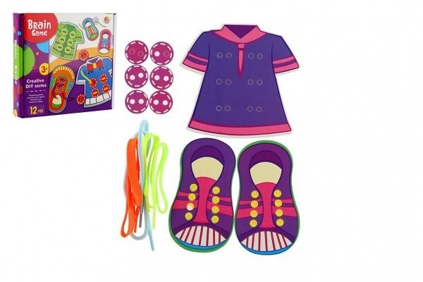 Potrénujte s dětmi vázání tkaniček a protahování šňůrek dírkami. Pomoci Vám může sada, která obsahuje šňůrky/tkaničky, botičky, košili/šaty a knoflíky z pevného kartonu.