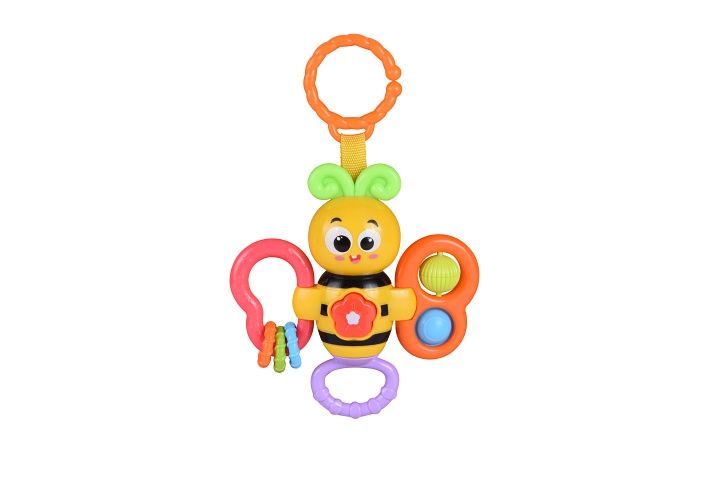 Včelka hrající s klipem. Velikost 14 cm. Tlačítko spouští a přepíná melodie. Chrastí, lze zavěsit. 2x AAA baterie součástí.