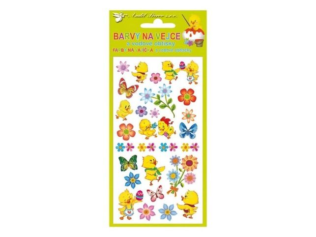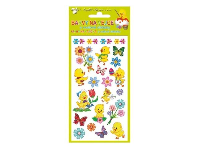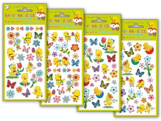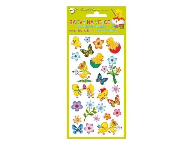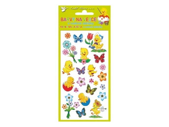 Barvy na velikonoční vejce 0,5g - jednotlivě, 4 barvy a vodové obtisky na vajíčka NÁVOD NA BARVY NA VAJÍČKA: 1. Obsah sáčku rozpusťte v 0,5 l vroucí vody a přidejte 4 lžíce octa. 2. Do barevného roztoku vložte čistá, odmaštěná a natvrdo uvařená vajíčka. 3. Po několika minutách obarvená vajíčka vyjměte a nechte oschnout. NÁVOD NA VODOVÉ OBTISKY: 1. Vystřihněte zvolený motiv a odstraňte krycí fólii. 2. Celý obrázek ponořte do misky s vodou, pak ho přiložte na vařené vajíčko motivem na skořápku a jemně přitiskněte. 3. Počkejte 20 - 30 sekund a opatrně odstraňte podkladový papír. Cena za 1 aršík,