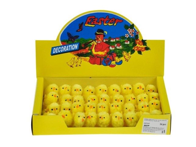 Velikonoční dekorace - plyšová žlutá kuřátka POUŽITÍ: Velikonoční kuřátka jsou vhodná pro dekorování košíčků, květináčů, věnců a pro aranžování velikonoční výzdoby. Velikost kuřátka: 3,5 cm Počet ks v balení: 36 ks Uvedená cena je za 1 ks.
