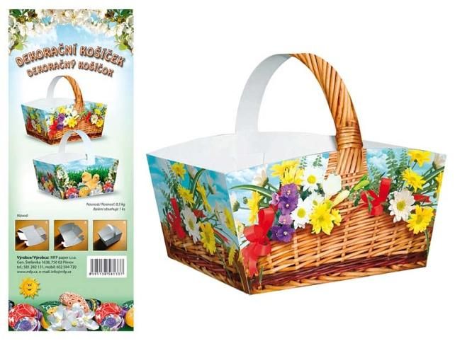 Velikonoční papírový košíček s motivem jarních květin, který vytvoří krásnou velikonoční dekoraci a oživí velikonoční atmosféru Vašeho domu. BALENÍ OBSAHUJE: - 1 ks rozloženého papírového košíčku s velikonočním motivem - návod k sestavení košíčku (ze zadní strany obalu) Nosnost: 0,5 kg