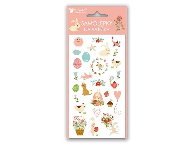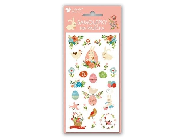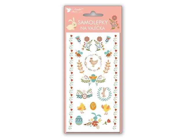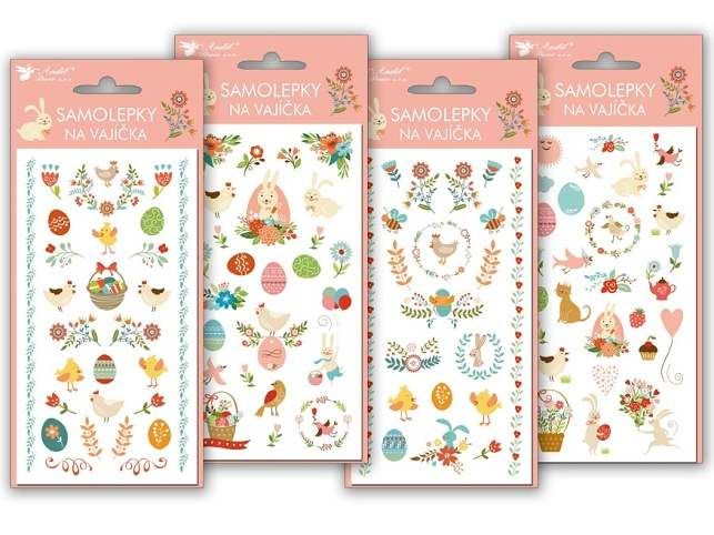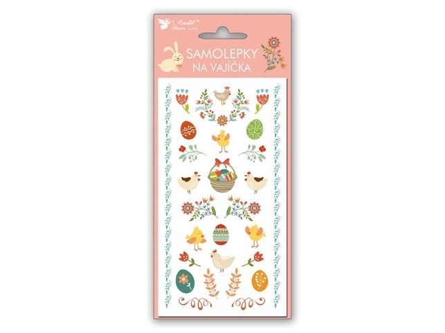 Samolepky na velikonoční vajíčka, na kterých jsou vyobrazeny obrázky velikonočních vajíček, kuřátek, oveček, ptáčků a dalších jarních a velikonočních motivů. (ve 4 provedeních) Jak nalepit samolepku na vejce: K dekorování použijte čisté, odmaštěné a suché vejce. Odstraňte krycí papír. Opatrně sloupněte vybraný obrázek z podkladové fólie. Lepicí stranou přiložte obrázek na vejce a prstem uhlaďte. Uvedená cena je za 1 aršík.