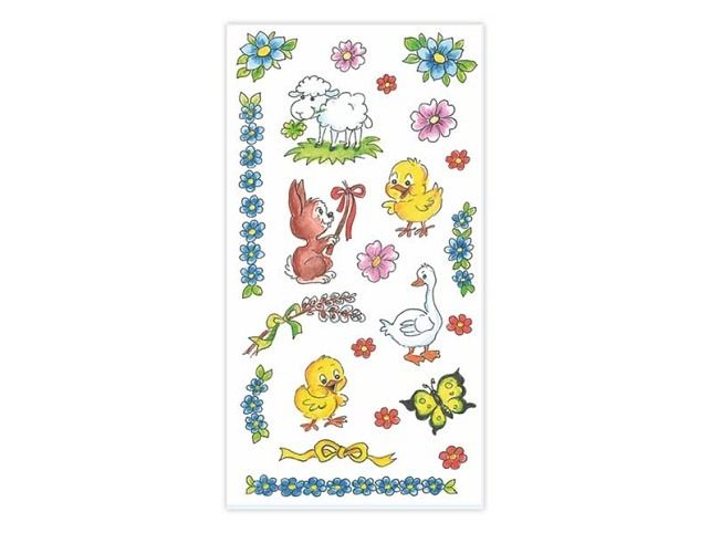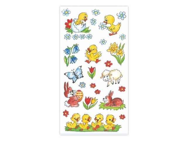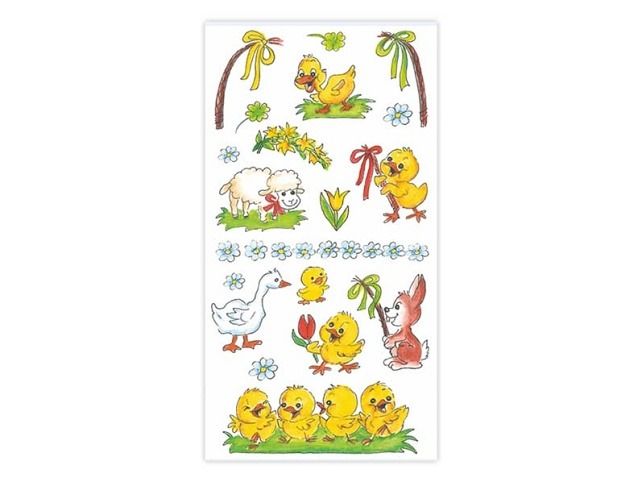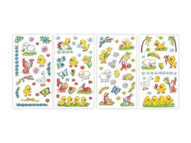 Samolepky na velikonoční vajíčka s tradiční motivy beránků, kuřátek, zajíčků, a dalších symbolů velikonoc a jara. Jak nalepit samolepku na vejce: 1. K dekorování použijte čisté, odmaštěné a suché vejce. 2. Odstraňte krycí papír. Opatrně sloupněte vybraný obrázek z podkladové fólie. 3. Lepící stranou přiložte obrázek na vejce a prstem uhlaďte. Cena za 1 aršík.