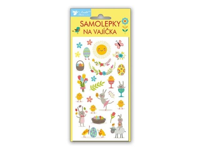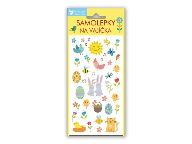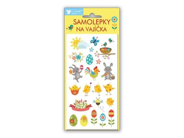 Samolepky na velikonoční vajíčka. Najdete zde obrázky velikonočních vajíček, kuřátek, ovečky, ptáčků a dalších jarních a velikonočních motivů. Jak nalepit samolepku na vejce: K dekorování použijte čisté, odmaštěné a suché vejce. Odstraňte krycí papír. Opatrně sloupněte vybraný obrázek z podkladové fólie. Lepicí stranou přiložte obrázek na vejce a prstem uhlaďte. Uvedená cena je za 1 aršík.