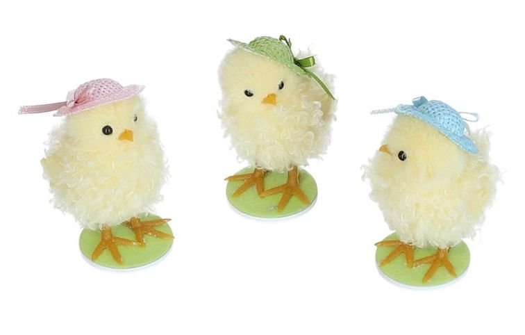 Velikonoční kuřátko s kloboučkem – jarní dekorace na podstavci 8cm