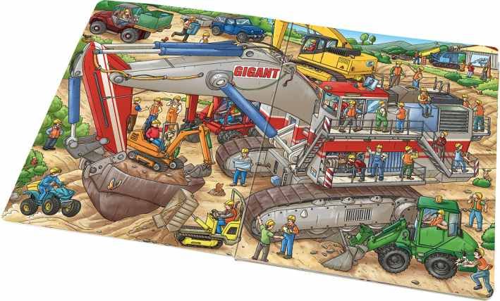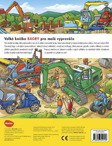 Tohle velkoformátové obrázkové leporelo ocení především fanoušci náklaďáků, bagrů, rypadel a dalších stojů, které pomáhají všude tam, kde se vzniká něco nového. Červený bagr s dvojitými pneumatikami, zelený kolový nakladač, oranžový minibagr, žluté pásové