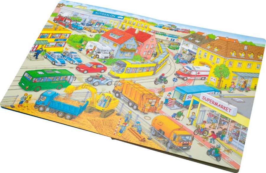 Tato velkoformátová kniha přináší panoramatické obrazové vhledy do prostředí silnic, staveb, ale i jiných. Bohatě propracované názorné ilustrace jsou pro děti velkým lákadlem, bezednou studnicí inspirace a zároveň obrovskou výzvou – množství detailů je přitahuje, podněcuje jejich představivost a fantazii. Malý vypravěč v interakci s dospělým nejen popisuje, co vidí na obrázcích, ale také v nich hledá, a hlavně kreativně a hravě rozplétá a opět spojuje nekonečné nitky možných příběhů. Knihy tak velmi účinně napomáhají budování slovní zásoby, komunikačních schopností i logického myšlení. Dítě tříbí svůj postřeh, zrakovou a sluchovou paměť, a činí tak první krůčky na své cestě k rozvoji aktivního čtenářství.