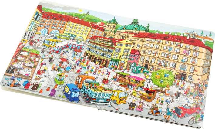 Velká knížka PRAHA. Jako modrý had se mezi pražskými kopci vine řeka Vltava překlenutá mnoha mosty a lávkami. Tím nejstarším, nejkrásnějším a nejznámějším je KARLŮV MOST. O letních prázdninách je na mostě pěkná tlačenice! Z mostu je překrásný pohled na Pražský hrad. Hrad je obrovský! Patří k největším na světě. Vydáme-li se tím směrem, nemůžeme minout MALOSTRANSKÉ NÁMĚSTÍ s chrámem svatého Mikuláše. I tam je pěkně rušno, obzvláště když po studené zimě vykoukne jarní sluníčko. A půjdeme-li z mostu na druhou stranu, dorazíme do centra města – na nejstarší a nejvýznamnější náměstí Prahy – STAROMĚSTSKÉ NÁMĚSTÍ s krásnou radnicí a magickým orlojem. A když přicházejí Vánoce, to je teprve kouzlo! Ale Praha, to nejsou jen domy, mosty a chrámy. Tak například STROMOVKA, to je jedno velké hřiště a nejen pro děti...!