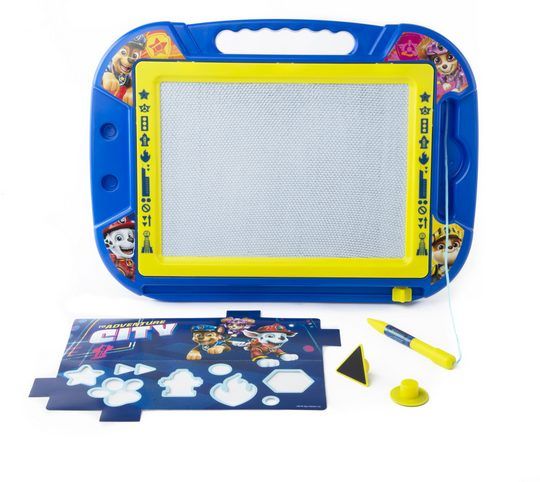 Velká magnetická kreslící tabulka +šablony Tlapková patrola. Obsahuje magnetickou tabulky, 2 magnetická razítka, magnetické pero a šablony.