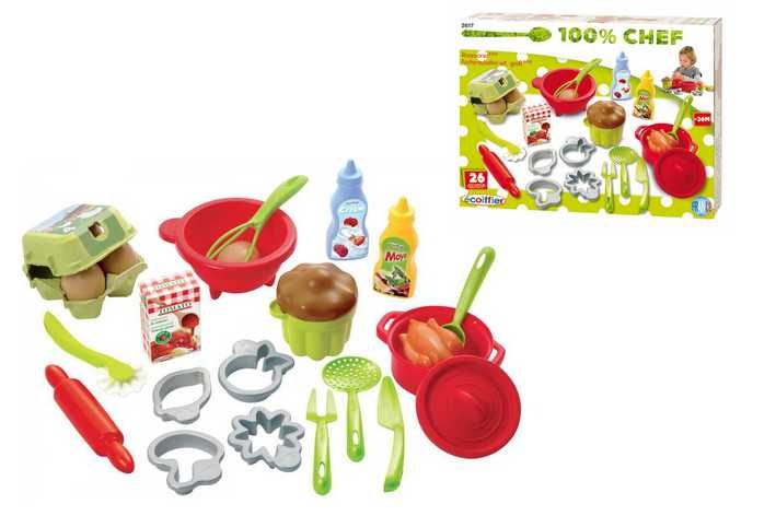Sada obsahuje 31 dílů - hrnec, misku, vykrajovátka, váleček, nůž, vidličku, metličku, několik druhů potravin a další. Vyrobeno z plastu.