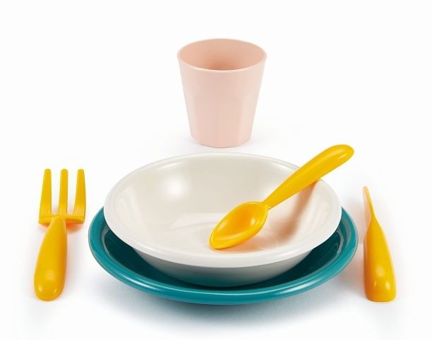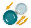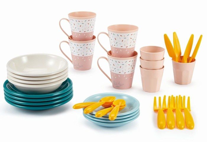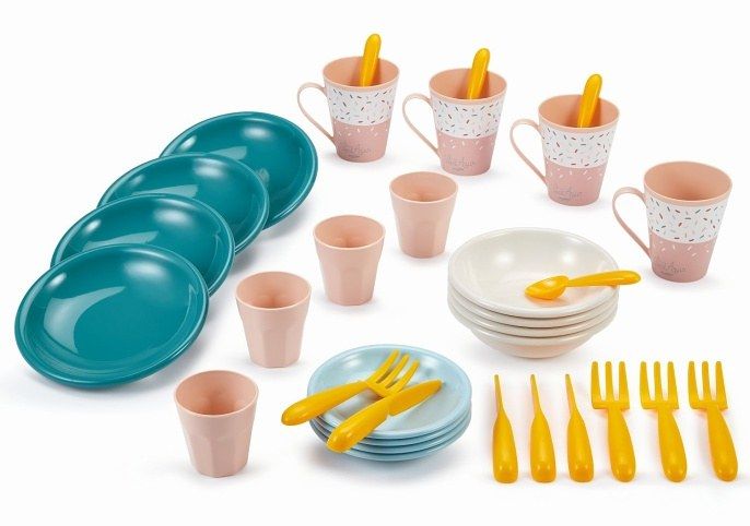 Sada nádobí obsahuje talíře, talířky dezertní, misky, hrníčky, kelímky a příbory. Celkem obsahuje 32 ks. Baleno v praktické krabici s otvory pro snadný přenos na zahradu, na návštěvu atd. Krabice zároveň slouží i jako servírovací stolek.