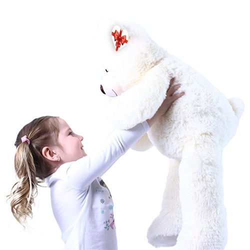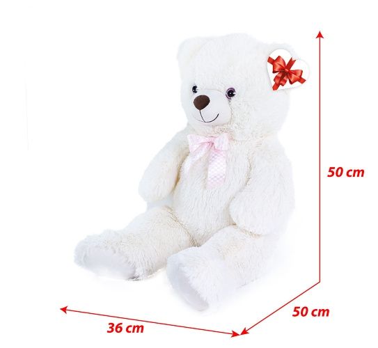 Plyšový medvěd nesmí chybět v žádném dětském pokojíčku! Medvěd ve velikosti 78 cm je vyroben z kvalitní heboučké plyše, má krémově bílou barvu a krk mu zdobí růžová saténová mašle. Tento plyšový kousek je ideálním dárkem pro malé i velké! Součástí je papírová visačka ve tvaru srdíčka, na kterou můžete napsat věnování.