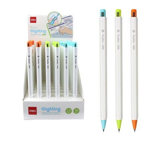 Šestihranné plastové tělo- stiskací mechanismus- výsuvný hrot- obsahuje ořezávátko- tuha: 2mm