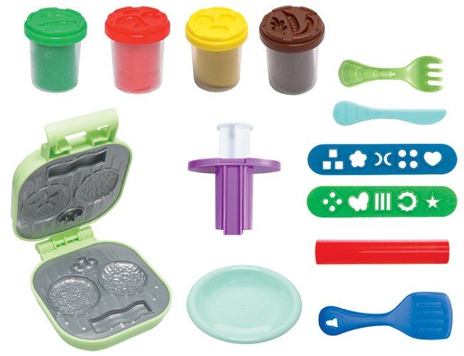 Modelína, ve které jsou různá tvořítka a formičky na výrobu hamburgeru. Včetně modelovací hmoty.