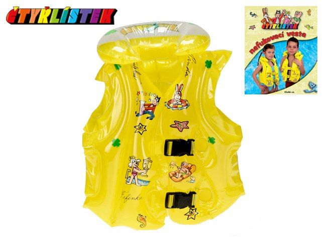 Dětská vesta do vody s motivem postaviček z oblíbené pohádky Čtyřlístek. Velikost nafukovací vesty je 51 x 46 cm. Vyrobena je z pevného a kvalitního materiálu. Vesta se zapíná pomocí 2 bezpečnostních přezek. Součástí je také nafukovací límec pro lepší stabilizaci hlavy. Výrobek je vhodným doplňkem při učení plavání malých dětí, neslouží však jako záchranná pomůcka.