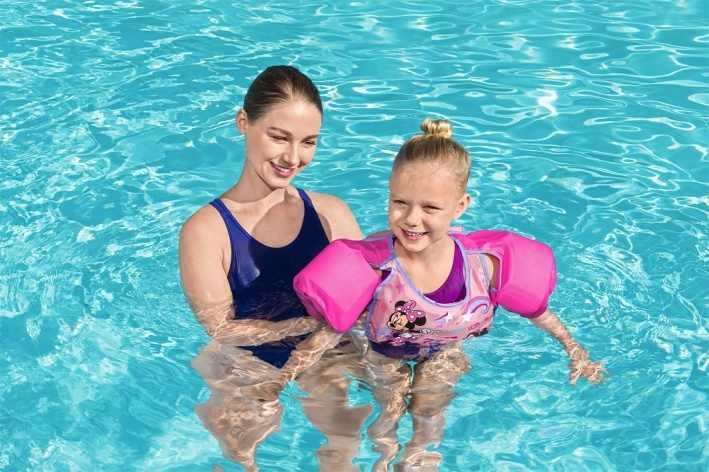 Plovací vesta pro děti od 3 do 6 let o velikosti 51 cm (nosnost 19–30 kg). 50+UPF, veselý design Minnie, nastavitelná přezka a popruh, odolný zip s automatickým zámkem.
