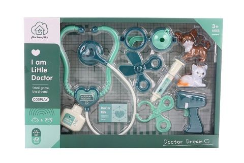 Sada veterinář s pejskem a kočičkou. Materiál plast. Obsahuje teploměr na baterie, které jsou součástí balení. Rozměry balení 41,5x28x5 cm. Věk 3+