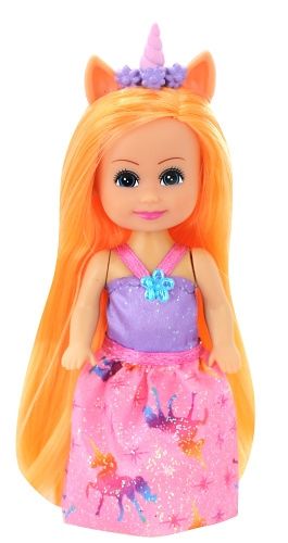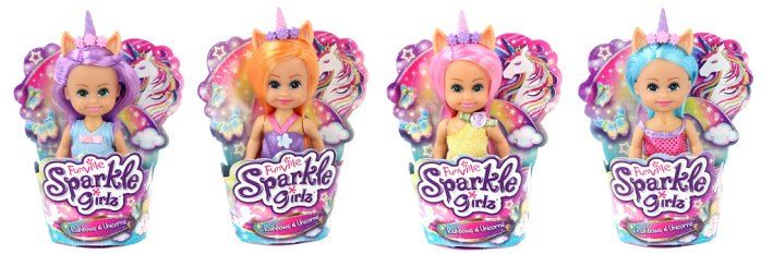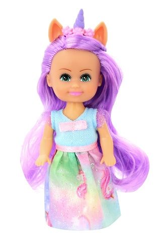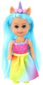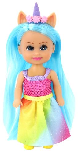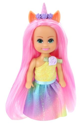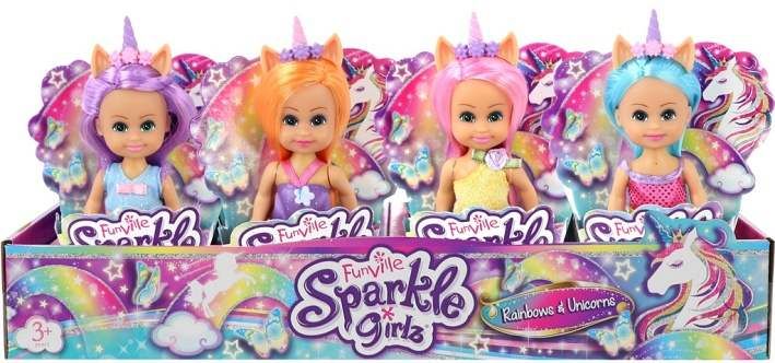 Duhová víla nebo víla s rohem Sparkle Girlz, která je 12 cm velká.V obalu, který připomíná kornoutek. Panenky mají překrásnéšatičky.