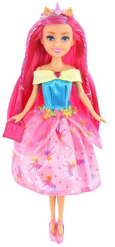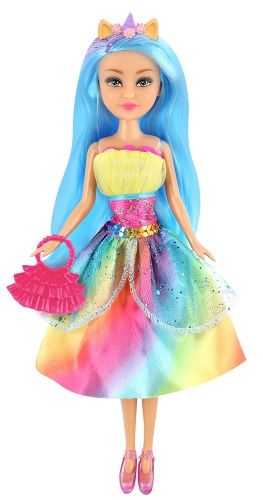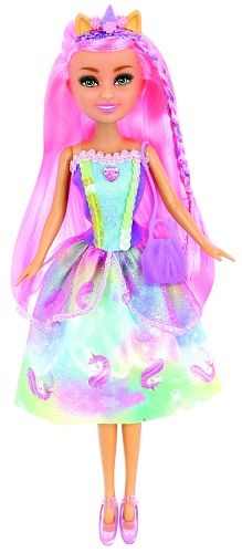 Panenka s rohem od jednorožce, která má překrásně barevné šatičky.Je 28 cm veliká. V sadě se nachází kabelka a střevíčky.