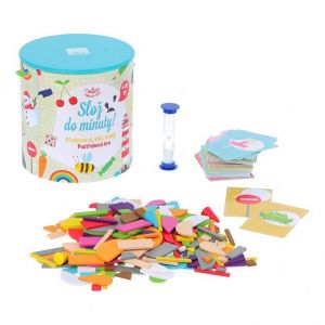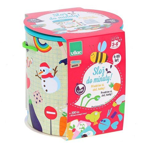 Zábavná hra, která rozvíjí dětskou představivost a postřeh. Vezměte si kartičku a z dostupných tvarů do minuty postavte obrázek. Hra pro všechny od 4 do 99 let. Podle věku hráčů můžete zvýšit čas pro řešení, nebo hrát bez časového limitu. Hra je spolu českým a slovenským návodem dodávána v praktickém kartónovém kyblíku opatřeném potiskem v češtině. Hlavní vlastnosti:4 figurky, 250 dílků, 100 karet předloh, přesýpací hodiny a bodovací tabulkapro 3–6 hráčůatraktivní zpracovánípraktické balení Pravidla hry Slož do minuty: Slož do minuty SÓLO (pro nejméně 3 hráče, jeden hráč pomáhá ostatním hádat)Všichni hráči položí svou figurku na start bodovací tabulky. Jeden z hráčů si vezme jednu obrázkovou kartu bez toho, aby ji ukázal ostatním hráčům. Bez toho, aby cokoliv říkal, má tento hráč jednu minutu na to, aby složil obrázek z karty z tolika dřevěných dílků, z kolika jen může, aby pomohl ostatním hráčům uhodnout, jaký obrázek je na jeho kartě. Hráč, který uhodne jako první dostává bod a posunuje svou figurku dopředu po bodovací tabulce. Hráč, který obrázek složil, také dostává bod a posunuje svou figurku dopředu po bodovací tabulce. Použitá karta se dá stranou. Pokud hráč, který skládá obrázek, pomůže ostatním hráčům uhodnout, co je na kartě ve stanoveném čase, nebo promluví, nedostane žádné body a karta se vrací do spodu balíčku. Na řadě je poté další hráč. Vyhrává hráč, který jako první dostane figurku na políčko zajíce. Slož do minuty TÝM (pro nejméně 4 hráče)Každý tým položí svo