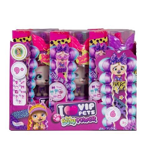VIP PETS BOW POWER přinášejí ty nejbarevnější městské účesy! K dostání je 6 pejsků: Kim, Natty, Aurora, Shiara, Gwen a Juliet. Každý pejsek s sebou má 9+ překvapení a 6+ různých vlasových doplňků, všechny mají jinou stuhu! Jako v seriálu na Youtube! Toto balení obsahuje kadeřnické křeslo, které vám pomůže upravit vaše VIP Pets účesy. Perfektní zábava pro děti od 4 do 6 let.