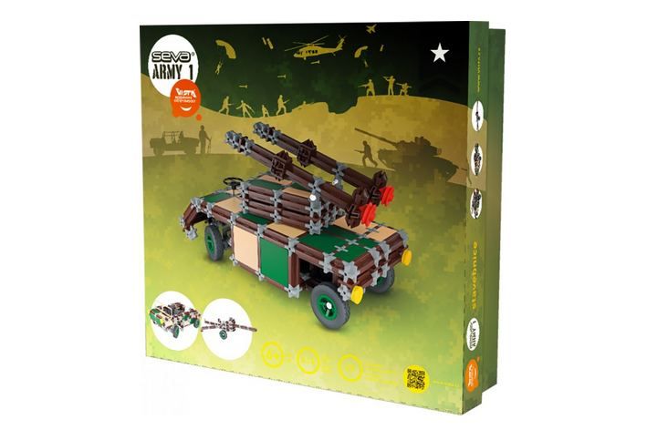 Stavebnice Seva ARMY 1 obsahuje 514 dílků, ze kterých si můžete sestavit vojenskou techniku např. dělo vlečené džípem, či vozidlo protivzdušné obrany. Dílky jsou ve vojenských barvách, takže postavené modely vypadají opravdu atraktivně.