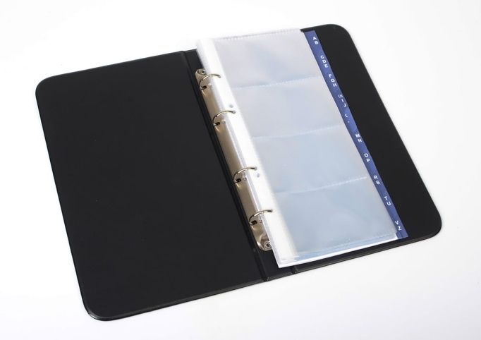 Oblíbený vizitkář s kroužkovou mechanikou a vnitřními listy až na 80 ks vizitek. Doplněn registrem A-Z.