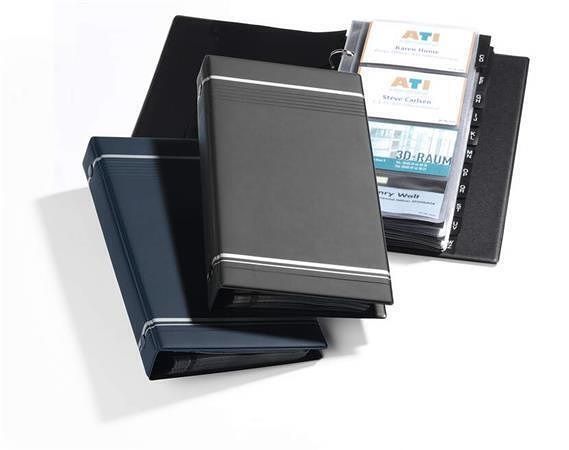 Kroužkový pořadač na vizitky, matný povrch, se stříbrnými ozdobnými pruhy.