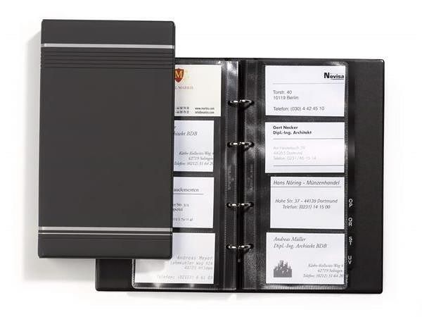 Kroužkový pořadač na vizitky, matný povrch, se stříbrnými ozdobnými pruhy.