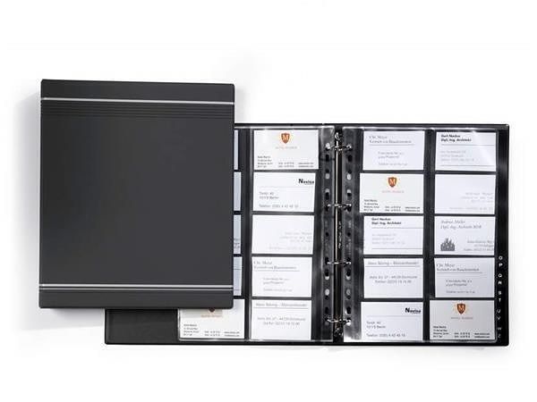 Kroužkový pořadač na vizitky ve formátu A4, matný povrch, se stříbrnými ozdobnými pruhy.
