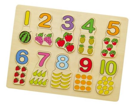 Vkládačka dřevěná čísla a ovoce.10 různých částí. Rozvíjí dětskou představivost a motoriku. Vyrobeno z kvalitního dřeva.
