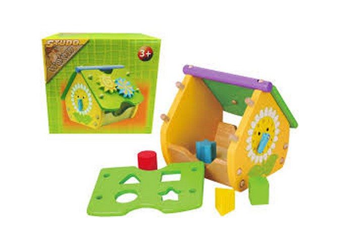 Domeček se dá celý složit a opětovně rozložit. Skládá se z 6 dílů. Jedna část střechy má vytvořené otvory, do kterých dítě vkládá hranoly s různými tvary základen (čtverec, trojúhelník, kruh a hvězda). Druhá část střechy obsahuje dvě pohyblivá ozubená kolečka, se kterými lze točit. Štít domu má hodinový ciferník s pohyblivými ručičkami.
