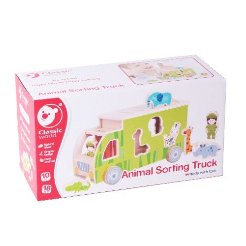 S tímto dřevěným kamionem se naučí děti rozeznávat různé tvary a poznávat zvířata. Dva strážci řídí kamion a ony mohou roztřídit různá divoká zvířata a naložit je do nákladního auta tak, že je přizpůsobí správnému tvaru.