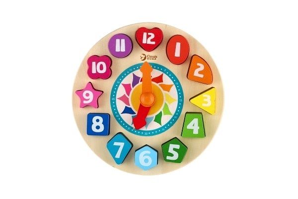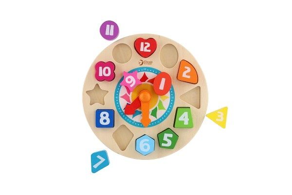 Dřevěné hodiny s vkládacími geometrickými tvary (na kterých jsou číslice) a otočnou malou a velkou ručičkou. Děti si procvičí hodiny, minuty, učí se rozeznat jednotlivé barvy a tvary, určovat a nastavovat správný čas. Díky této hračce bude pro děti jednodušší představit si, kdy mají jít spát, kdy je čas oběda nebo kdy si mohou hrát. Balení obsahuje 15 dřevěných dílků.