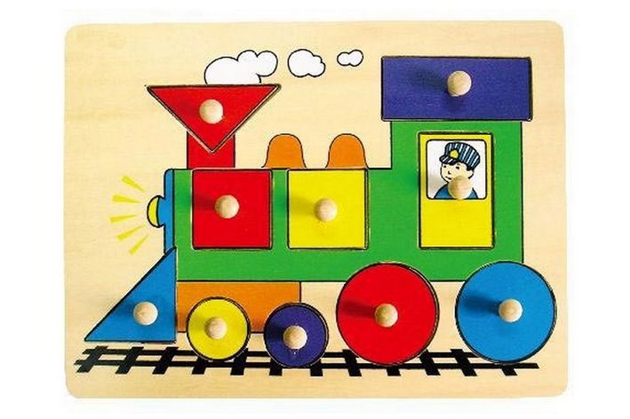 Set devíti dílků vytvarovaných tak, aby šly umístnit do výřezů dřevěné desky. Barevný vláček si mohou děti opětovně zkoušet složit a najít pro daný tvar správný výřez.