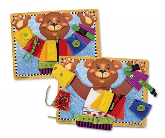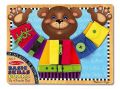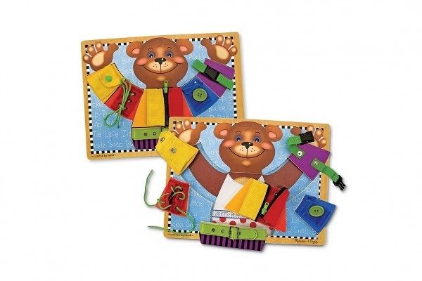 Tento dřevěný medvídek se vždy směje, ale nejšťastnější je, když je celý oblečený. Zapni mu zip, přesky, knoflík a zašněruj, utáhni a zavaž tkaničku.