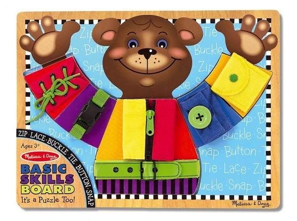 Každá dovednost je obsažena na samostaném kusu. Rozvíjí jemnou motoriku. Balení obsahuje dřevěnou destičku a 6 ks zapínání.