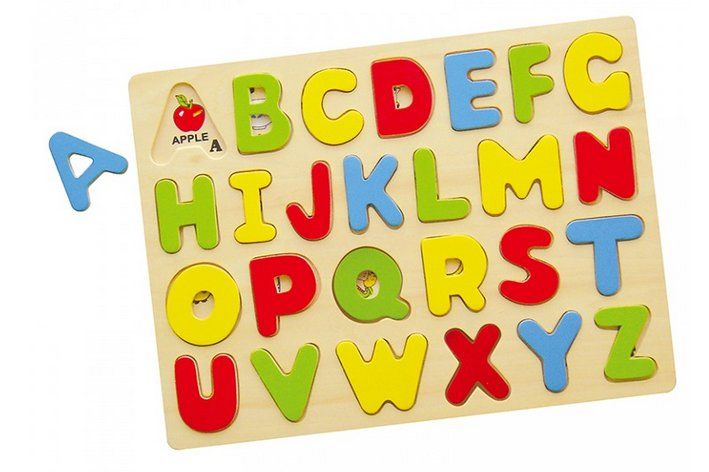 Dřevěná barevná vkládačka bez úchytek pro děti pro první seznamování s písmenky. Jednotlivé dílky (písmena) se umísťují do vyfrézovaných obrysů na dřevěnou desku. Pod písmenky se ukrývá obrázek s anglickým názvem.