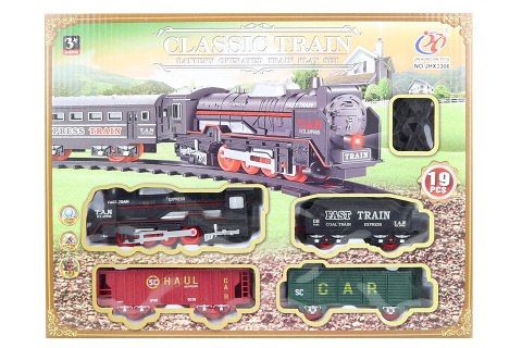Nákladní vlaková souprava na baterie. Rozměry sestavené vláčkodráhy cca 91 cm. Mašinka je funkční na 2 AA baterie (nejsou součástí). Rozměry balení cca 32 x 25 x 4,5 cm. Věk 3+