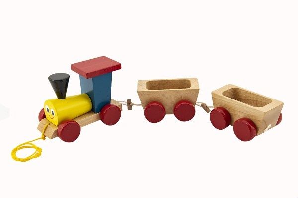 Barevný dřevěný tahací vlak se dvěma vagony pro malé děti. Vyrobeno z kvalitního dřeva. Délka 43 cm.