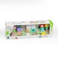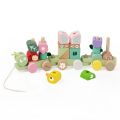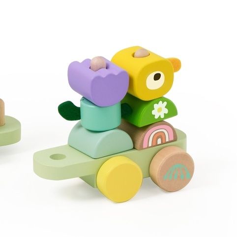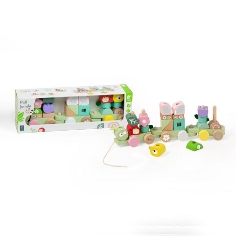 Barevný dřevěný vláček s motivem džungle přináší zábavu na kolečkách i při skládání! Skládá se z lokomotivy a dvou vagónků, které jsou osazeny dřevěnými kolíky pro navlékání 27 různorodých dílků. Děti si rozvíjejí jemnou motoriku, učí se barvy, tvary i logiku skládání. Díky tahacímu provázku si mohou vláček snadno vzít s sebou po celém bytě. Hrací set v jemných pastelových barvách zaujme každé zvídavé batole.