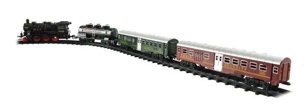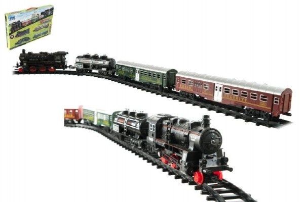 Vlak + 3 vagóny s kolejemi 24ks plast na baterie se světlem se zvukem v krabici 59x39x6cm