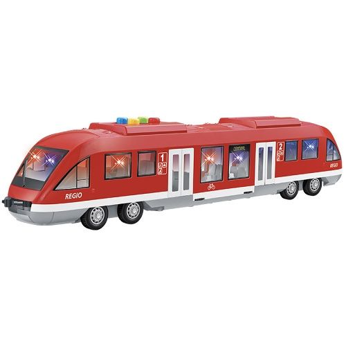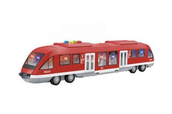 Vlak – zvukové a světelné efekty (interaktivní zvuky, nádražní hlášení, světlo), na setrvačník. Výrobek na baterie 2×AA – baterie jsou součástí.