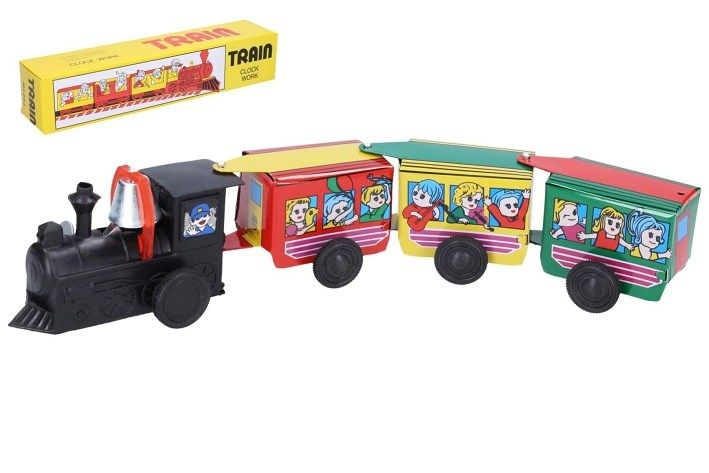 Natahovací kovový vlak, lokomotiva a dva vagónky zaujme jistě každé malé dítko. Stačí natáhnout klíček a vláček jede jako o závod.