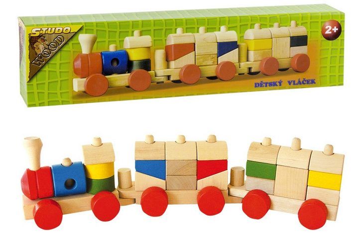 Barevný dřevěný vláček pro milovníky tradičních lokomotiv. Dřevěný vláček se skládá z mašinky, dvou vagónků s různým nákladem. Vláček lze rozložit na jednotlivé barevné (i v provedení přírodní barvy dřeva) kostičky a opět lehce složit nasazením na kolíky. Vláček má mnoho využití jako je stavebnice, skládanka nebo klasická mašinka s vagónky. Hračka rozvíjí motoriku a fantazii dítěte.