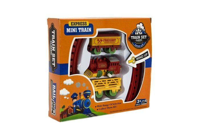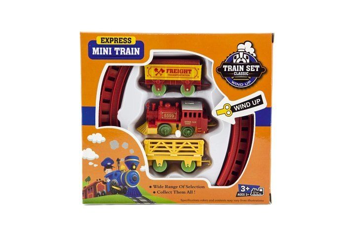 Vlak na klíček + 2 vagónky s kolejemi plast 7cm asst v krabičce 18x16x4cm 2 barvy