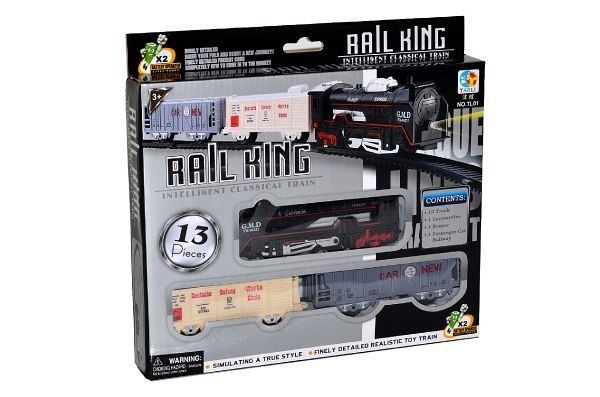 Detailně zpracovaná historická vlaková souprava na baterie s bohatým příslušenstvím. Světelné a zvukové efekty. Sada obsahuje 2 vagony, mašinku a koleje. Baterie 2xAA nejsou součástí balení.